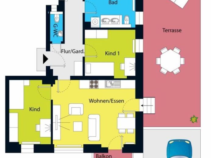 Sie verfügt über eine vorteilhafte Raumaufteilung. Vom hellen geräumigen Wohnzimmer aus, in welchem die offene Küche integriert ist, gelangen Sie einerseits auf die schöne Terrasse und andererseits auf den hübschen kleinen Balkon. Über einen individuellen Zuschnitt verfügt auch das Schlafzimmer. Zudem finden Sie zwei hübsche Kinderzimmer. Das moderne Tageslichtbad ist mit einer Wanne, einer Dusche, Doppelwaschbecken und dem Anschluss für Ihre Waschmaschine ausgestattet. Praktischerweise gibt es auch ein Gäste-WC. In allen Wohnräumen und im Flur liegt hochwertiger Vinylbelag. Bad und Gäste-WC sind gefliest.