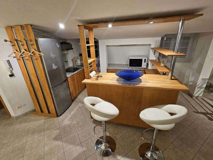 Die Massivholz-Einbauküche mit Tresen und Hochstühlen schafft eine einladende Atmosphäre.