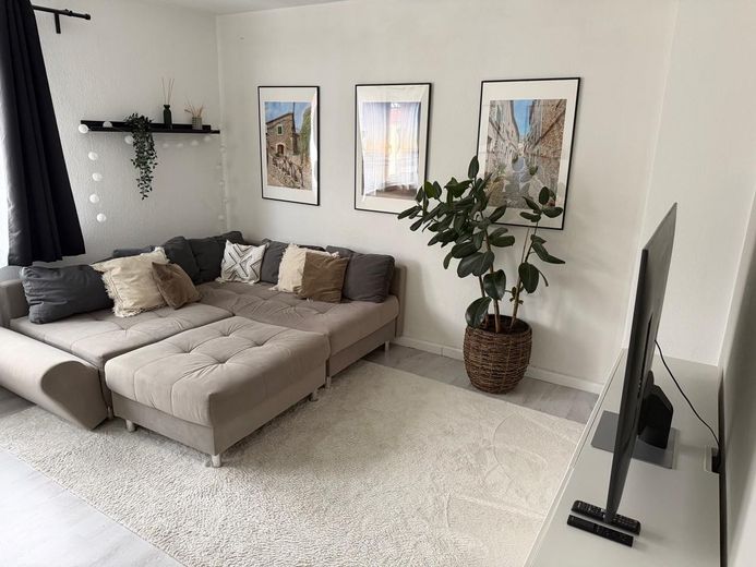 Die Küche ist großzügig geschnitten, ebenso das Wohnzimmer, welches noch Platz für einen Essbereich bietet.