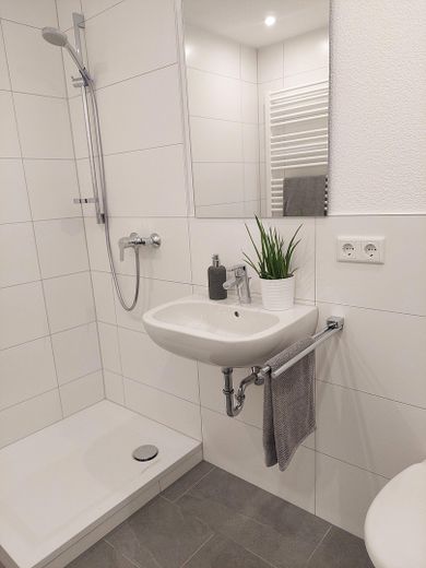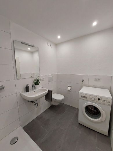 - Neues Bad (Dusche mit Glasabtrennung, WC, Waschtisch, beleuchteter Spiegel, Waschmaschine)