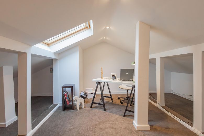 Das Obergeschoss bietet zwei gut geschnittene Schlafzimmer sowie ein modernes Badezimmer mit Badewanne – ideal als Eltern- und Kinderzimmer. Das ausgebaute Dachgeschoss eignet sich hervorragend als Homeoffice, Spielzimmer oder persönlicher Rückzugsort.