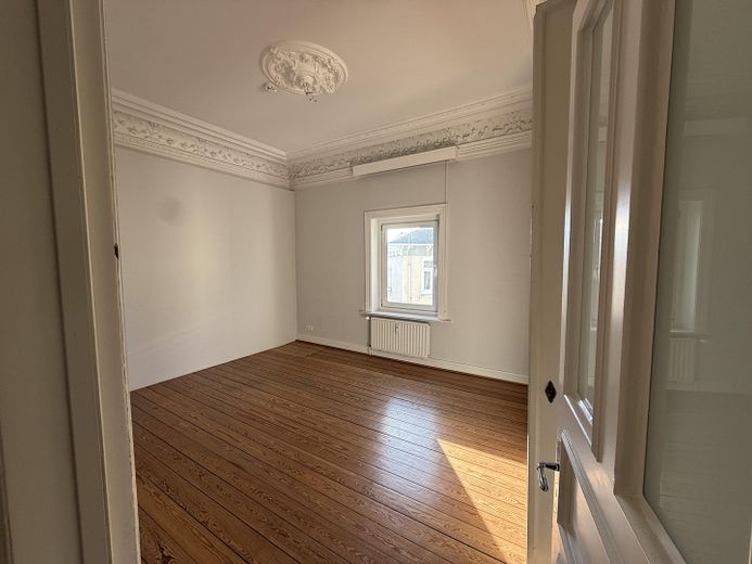 Inmitten des historischen Blankeneser Treppenviertels, dort wo sich die Elbhänge in ihrer schönsten Form zeigen, öffnet sich diese außergewöhnliche Wohnung über die gesamte Beletage eines repräsentativen Hauses. Bereits beim Eintreten entfaltet sich ein eindrucksvoller Raumeindruck: hohe Decken, feine Stuckelemente und ein Wohnbereich, der sich mit einer einzigen klaren Geste zur Elbe hin öffnet. Durch das große Balkonfenster fällt der Blick unmittelbar auf die Elbe – ein eindrucksvoller Moment, der diese Wohnung unverwechselbar macht.