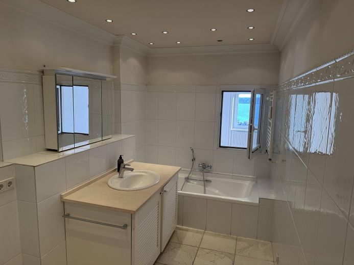 Die Küche ist gepflegt und funktionsfähig, bietet jedoch Potenzial für eine zeitgemäße Neuinterpretation oder – auf Wunsch – für eine Integration in den Wohnbereich, wodurch ein zusätzliches Zimmer entstünde. Das Badezimmer mit Dusche und Badewanne ist großzügig dimensioniert und eröffnet Möglichkeiten für die Realisierung eines zweiten Bades oder eines Gäste-WCs.