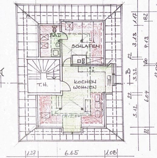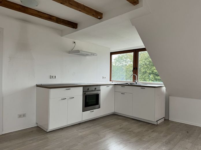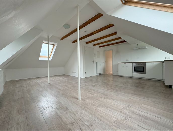 Das Herzstück der Wohnung ist der großzügige Wohn- und Essbereich, der durch die offene Bauweise besonders hell und freundlich wirkt. Die sichtbaren Holzbalken wurden sorgfältig aufgearbeitet und verleihen den Räumen einen warmen, charaktervollen Charme. Die frisch weiß gestrichenen Wände unterstreichen zusätzlich das luftige Raumgefühl.