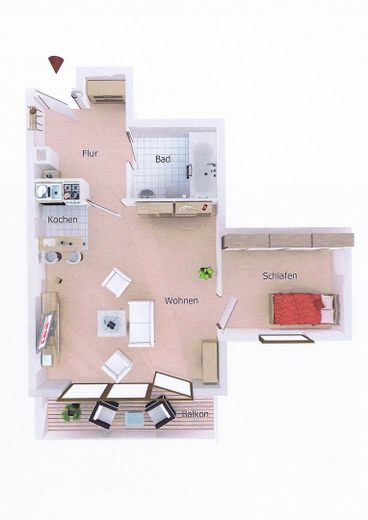 Die Wohnung besteht aus Flur, Bad, großzügigem Wohnzimmer mit intergrierter Pantry-Küchenzeile (Kühlschrank, Spüle, 2 Kochplatten, Kein Backofen!!) und Schlafzimmer.