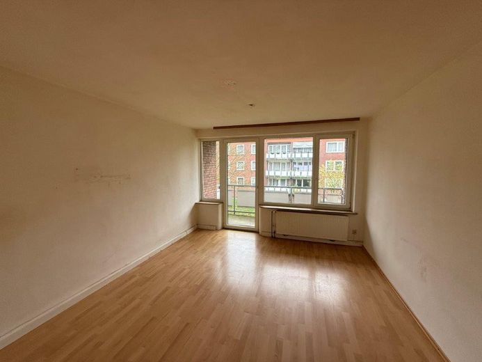 Die Wohnung liegt in einem Mehrfamilienhaus und bietet eine funktionale Aufteilung mit hellen, gut nutzbaren Räumen. Große Fenster sorgen für eine angenehme Lichtatmosphäre. Die Küche bietet ausreichend Platz für eine Einbauküche und einen kleinen Essbereich. Das Badezimmer ist zeitgemäß ausgestattet.