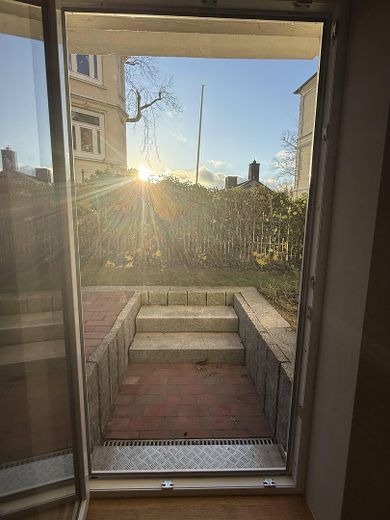 Vom Wohnbereich führen ein paar Stufen hinunter zur Terrasse und weiter in den etwa 50 m² großen Garten. Es ist ein stiller, geschützter Platz – und wenn man sich hinstellt, öffnet sich zwischen Bäumen und Fassaden ein kleiner Blick zur Elbe. Ein kurzer Augenblick, der daran erinnert, warum das Treppenviertel so besonders ist.