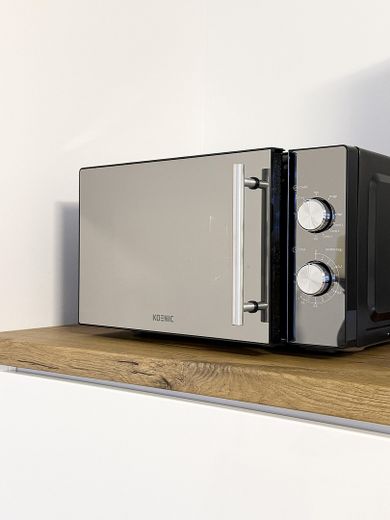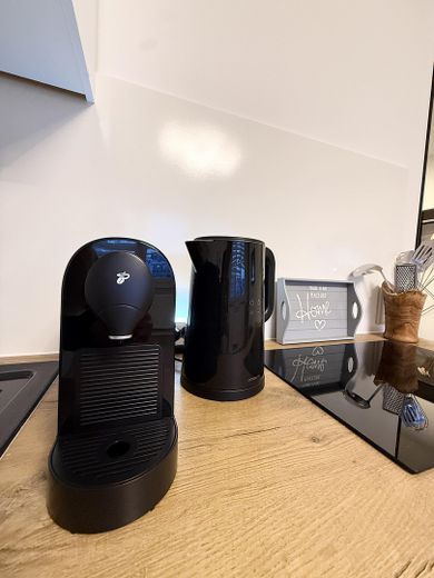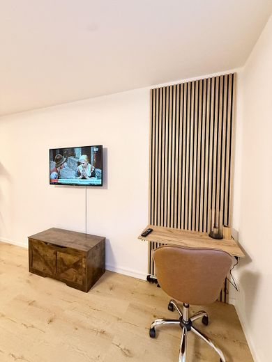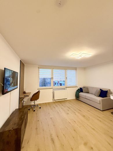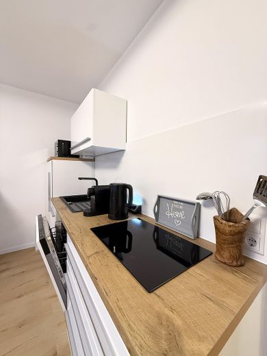 Der helle Wohn- und Schlafbereich ist geschmackvoll möbliert und bietet dank eines hochwertigen Schlafsofas mit echter Matratze höchsten Schlafkomfort – auch für den dauerhaften Gebrauch geeignet. Ein separater Essbereich sowie ein praktischer Arbeitsplatz machen die Wohnung ideal für Berufstätige, Pendler oder Projektmitarbeiter.