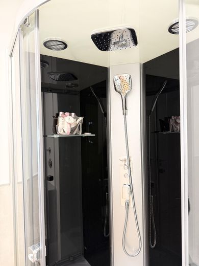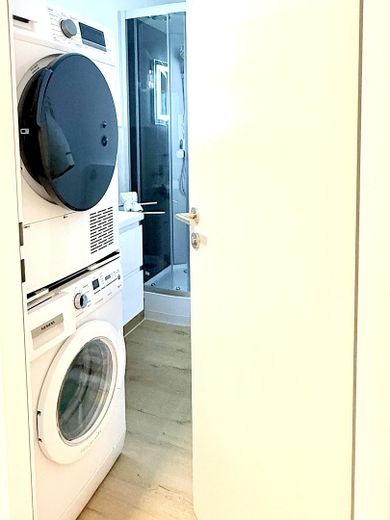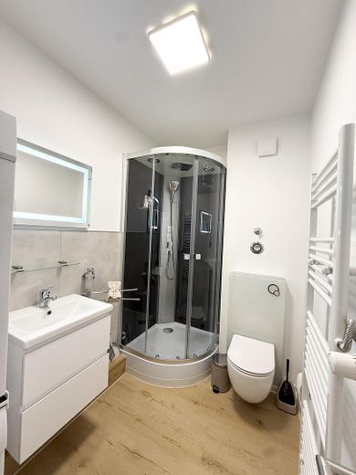 Das Badezimmer wurde vollständig erneuert und bietet eine moderne Dusche, ein elegantes Hänge-WC, neue Handtuchheizkörper sowie eine eigene Waschmaschine und einen separaten Trockner.