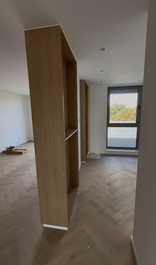 Die Wohnung vereint die Klarheit moderner Architektur mit der Wärme sorgfältig ausgewählter Materialien. Der Fischgrät-Vinylboden in Eichenoptik wirkt wie ein maßgeschneiderter Rahmen für das Interieur. Bodentiefe Fenster lassen viel Licht hinein und öffnen den Blick ins Grüne. Die Fußbodenheizung sorgt dabei ganzjährig für ein angenehmes Wohnklima.