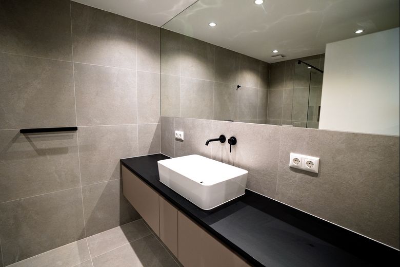 Das Badezimmer wurde wie ein kleiner Spa gestaltet: große Fliesen, eine offene