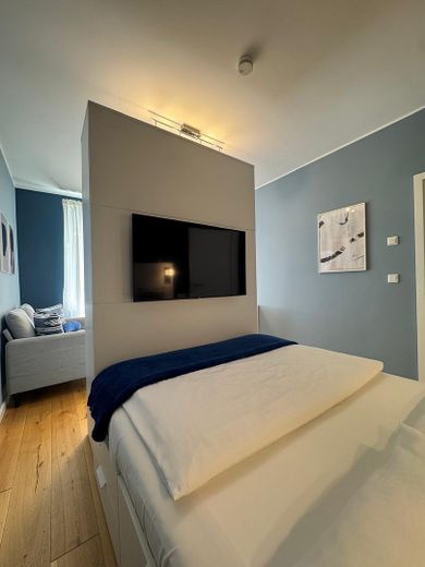 Im Schlafbereich befindet sich ein sehr bequemes Doppelbett mit einem Smart-TV für einen entspannten Abend. Alle Zimmer lassen sich mit Rollläden verdunkeln.