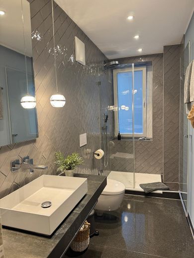 Im neuen Badezimmer befindet sich eine luxuriöse Regendusche mit bodentiefem Zugang , eine Toilette und ein Waschbecken. Du erhältst von uns hochwertige Handtücher.
