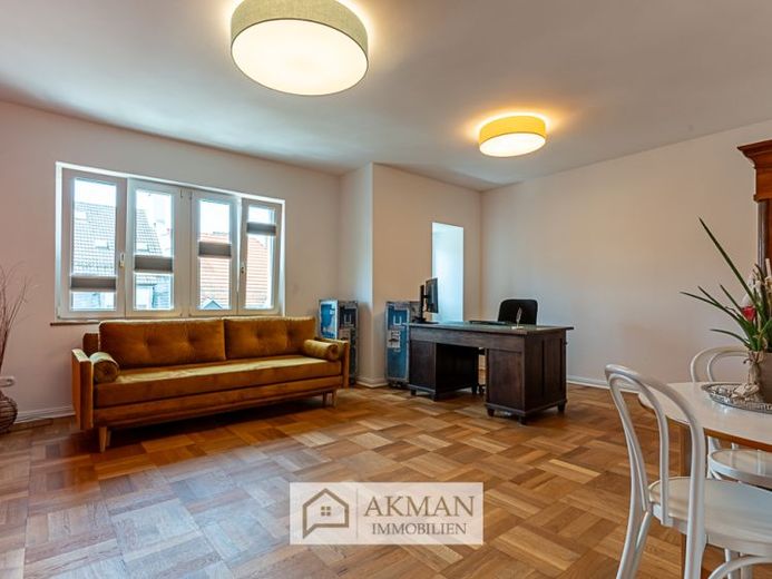 Das Wohn- und Schlafzimmer besticht durch einen schönen, massiven Parkettfußboden, während im komplett sanierten Tageslichtbad hochwertige Mosaikfliesen und in der Küche mit Zugang zum kleinen Balkon Feinsteinzeugfliesen verlegt wurden.
