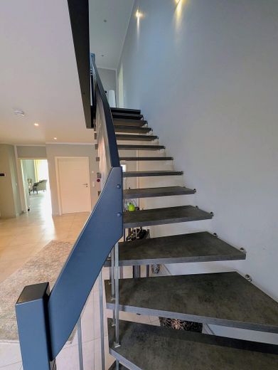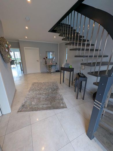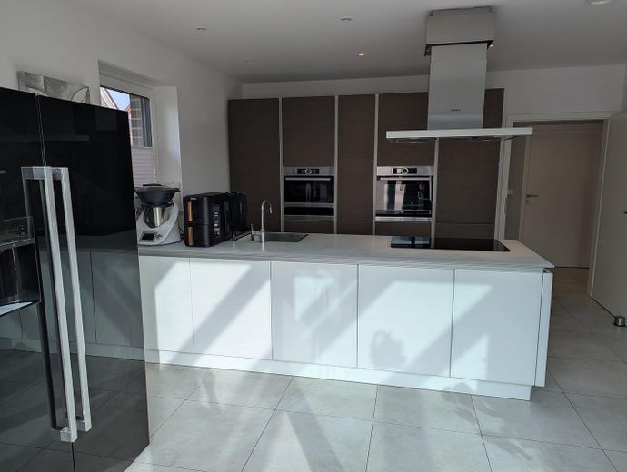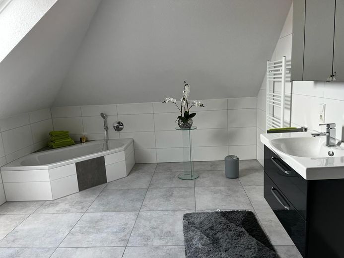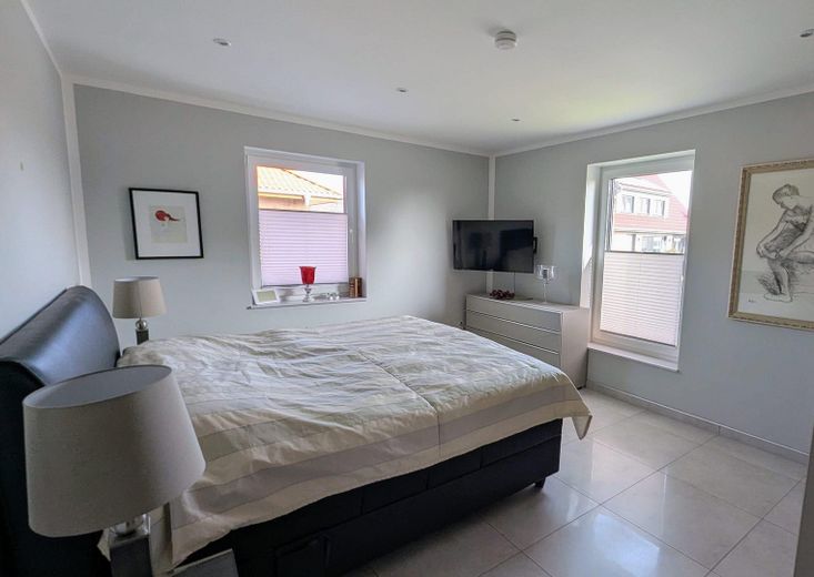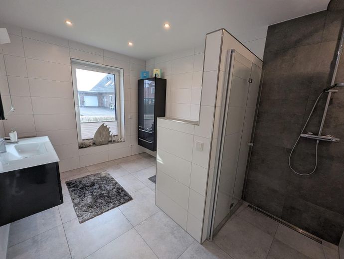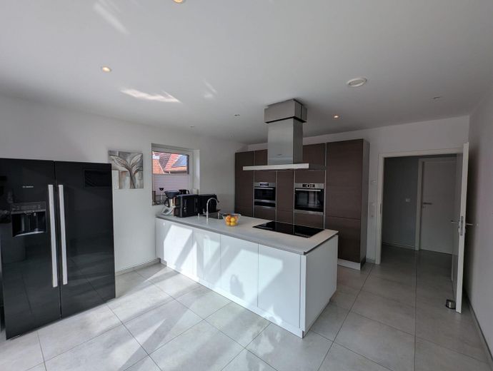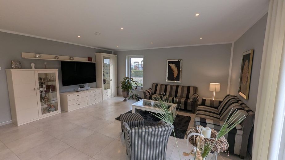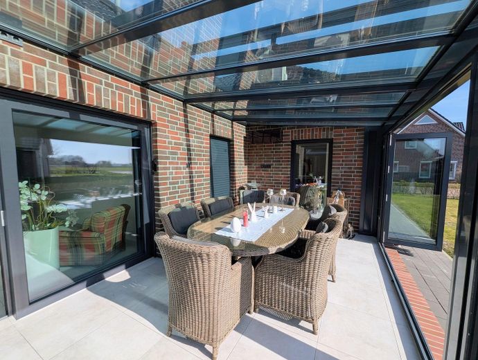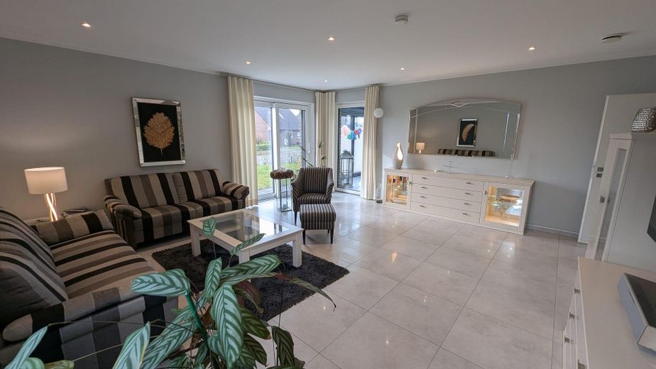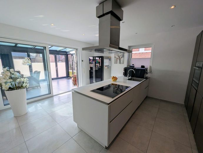 Von hier aus haben Sie direkten Zugang zum exklusiven Wintergarten, der den Wohnraum auf besondere Weise erweitert. Auch von der Küche aus ist der Wintergarten bequem begehbar, was kurze Wege und ein angenehmes Wohngefühl schafft – ideal für Alltag und Gäste gleichermaßen. Ein besonderes Ausstattungsmerkmal sind die zwei hochwertigen Einbauküchen. Diese Aufteilung ermöglicht eine klare Trennung zwischen privatem Wohnbereich und Ferienvermietung. Das Badezimmer im Erdgeschoss ist mit einer großen, bodengleichen Dusche ausgestattet. Das Gäste WC verfügt ebenfalls über eine Dusche. Die altersgerechte Bauweise garantiert komfortables, barrierearmes Wohnen – heute und in Zukunft. Der große Hauswirtschaftsraum mit hochwertigen Einbauschränken sorgt für außergewöhnlich viel Stauraum – Ordnung ist hier garantiert. Besonders praktisch ist der direkte Zugang von der Garage ins Haus. Der exklusive Wintergarten lässt sich offen oder vollständig geschlossen nutzen. Ergänzt wird das Angebot durch eine große Terrasse mit Sichtschutz, die Privatsphäre und entspannte Stunden im Freien ermöglicht. Das Haus ist mit einer energieeffizienten Junkers Gas-Brennwertheizung mit Solarunterstützung (solare Warmwasserbereitung, Aufdach-Solaranlage mit drei Flachkollektoren, witterungsgeführte Regelung) ausgestattet. Somit erfüllt das Haus hohe Ansprüche an Effizienz und Zukunftssicherheit.