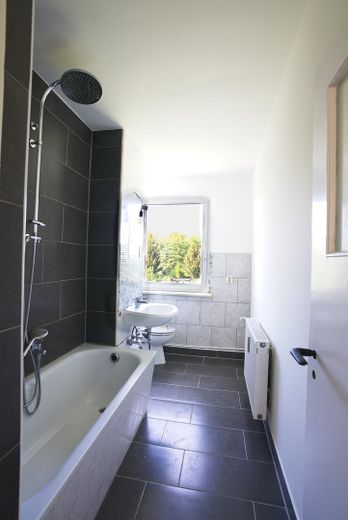 1x Badezimmer mit Badewanne und Fenster